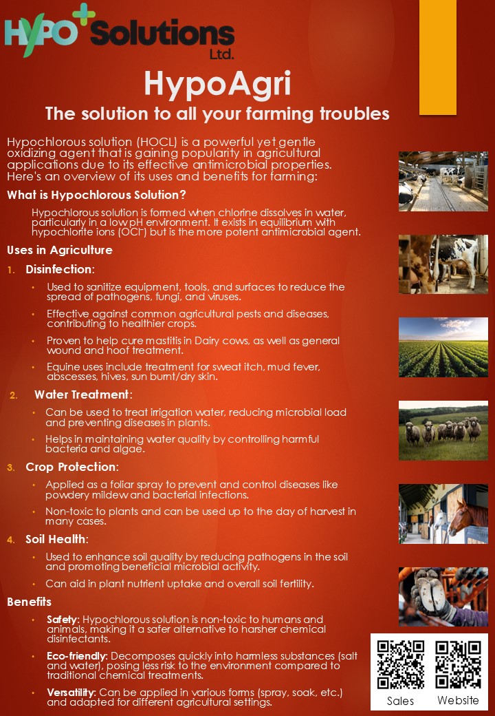 Hypo Agri has evolved to be to a diverticula solution for the Agricultural animal welfare industry both on and off farms. Hypo Agri should be your first go to before the request for medicine or antibiotics. Hypochlorous is the first thing any mammal produces naturally to fight a bacterial infection or virus before their antibodies kick in.