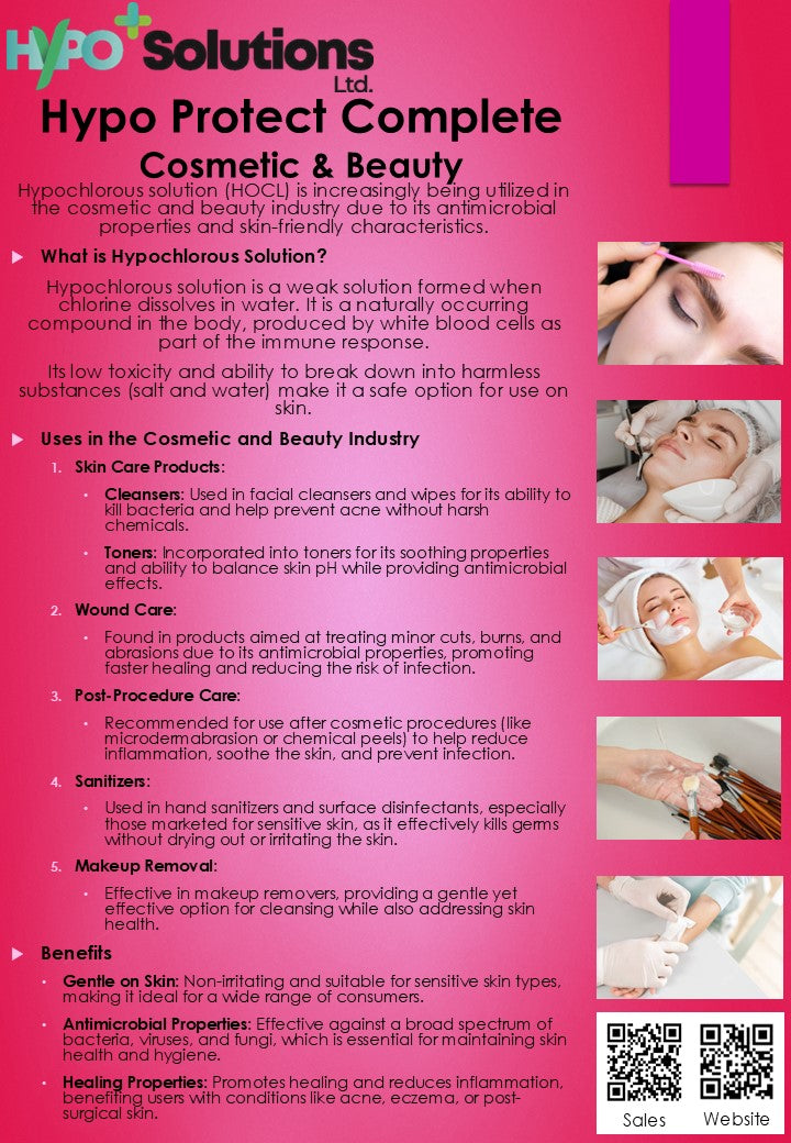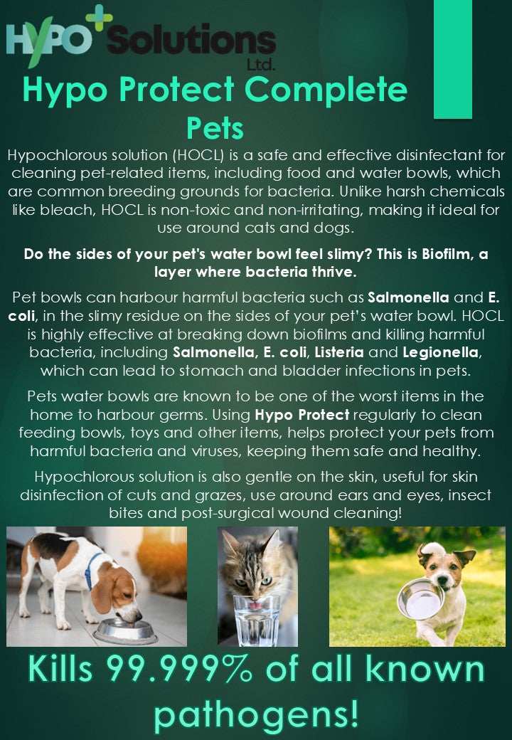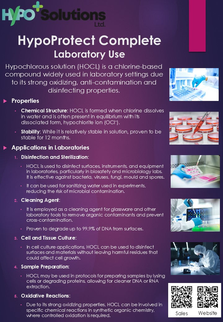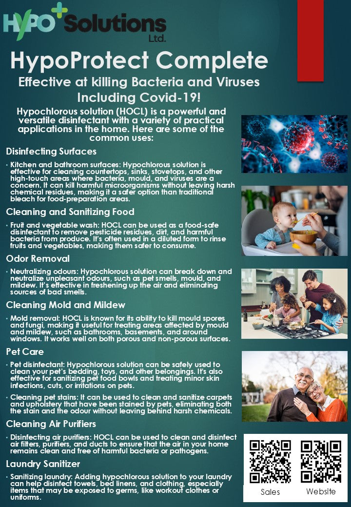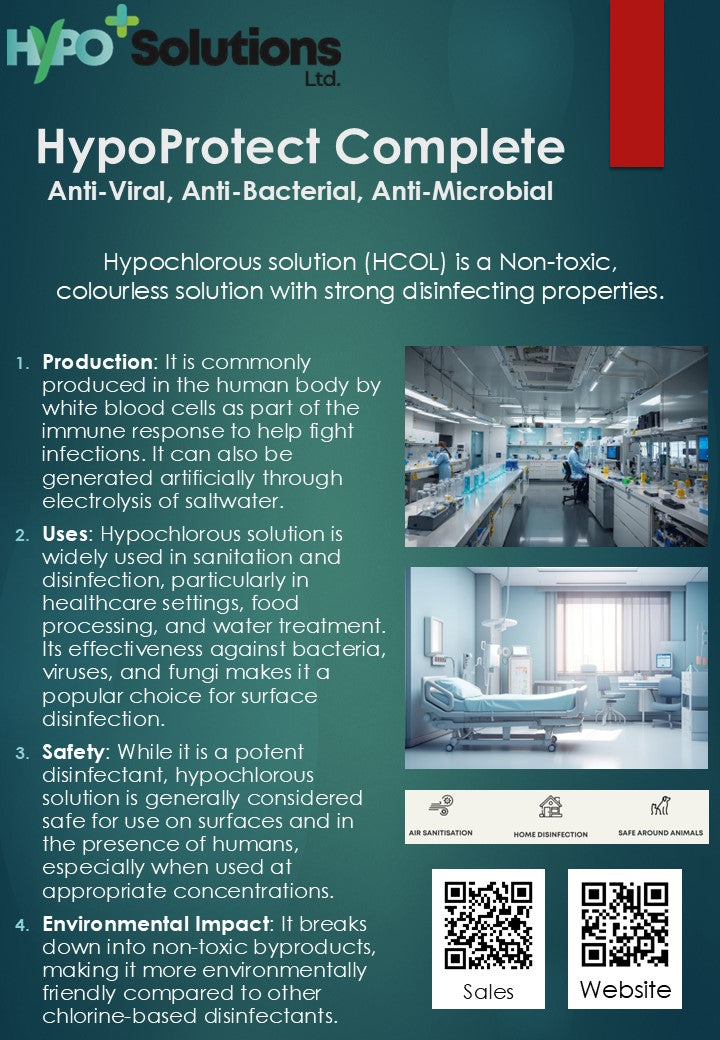 Hypo Protect Complete© is available as a 750ml trigger spray, 5L bottle, 20L refill and 1000L IBC tank Safety: While it is a potent disinfectant, hypochlorous solution is generally considered safe for use on surfaces and in the presence of humans, especially when used at appropriate concentrations.