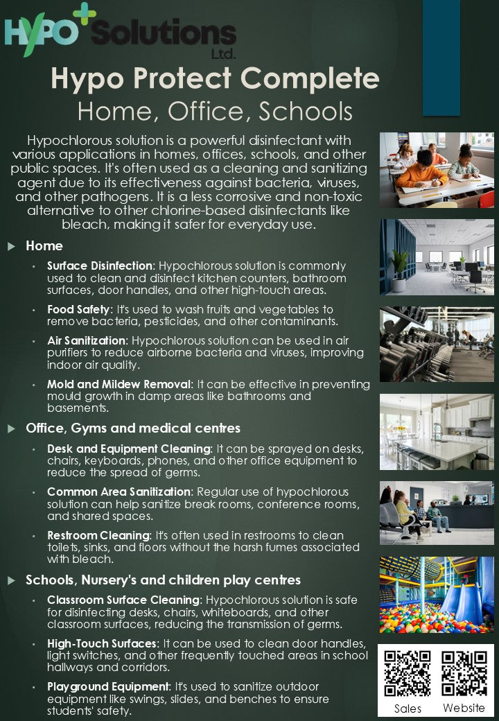 - Use for cleaning and sanitisation of offices, schools, medical centres and gyms. The list of potential applications for Hypo+Protect Complete© is endless, if it needs cleaning, Hypo Protect Complete© is perfect for any job.